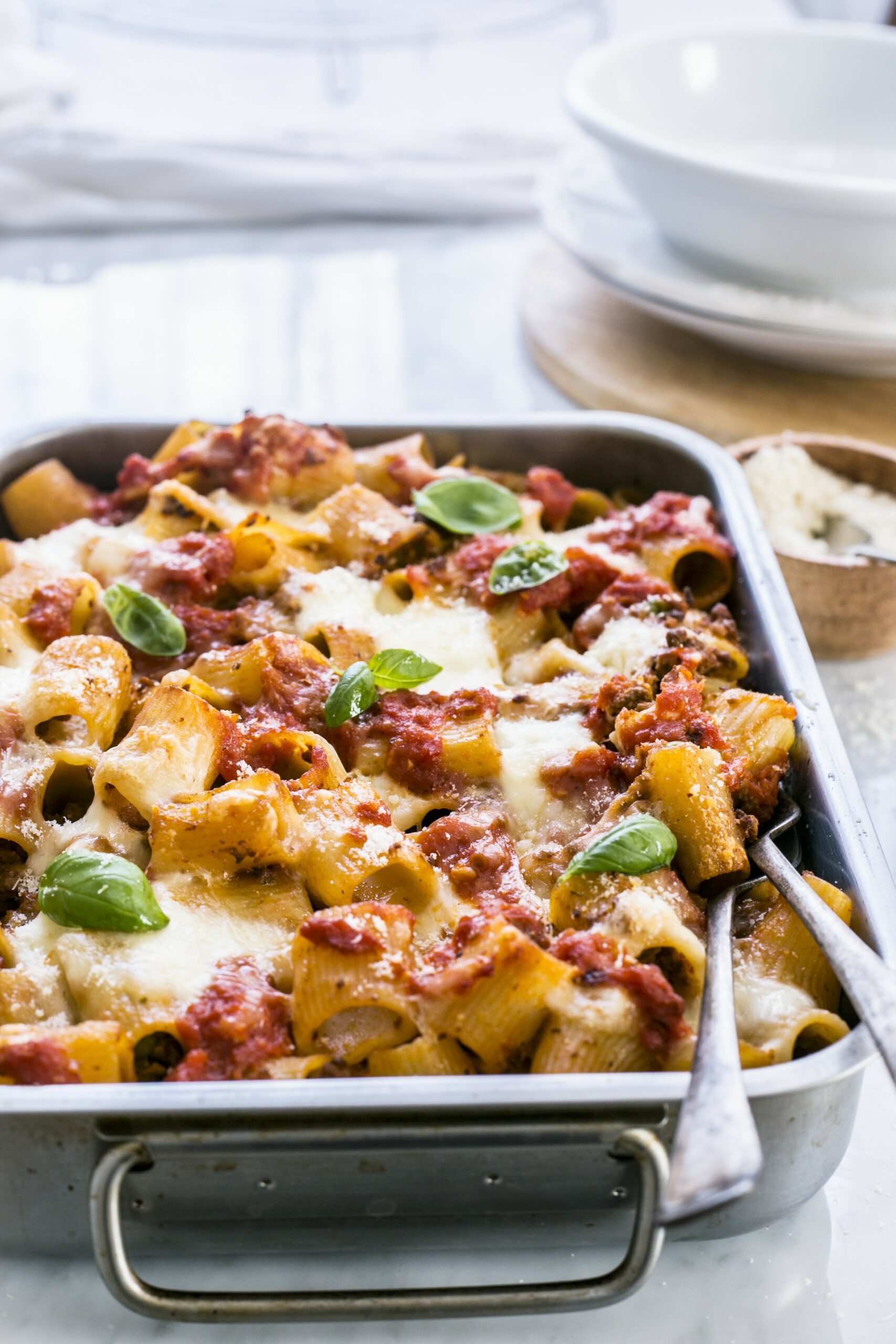 Gratin de pâtes au ragoût et mozzarella