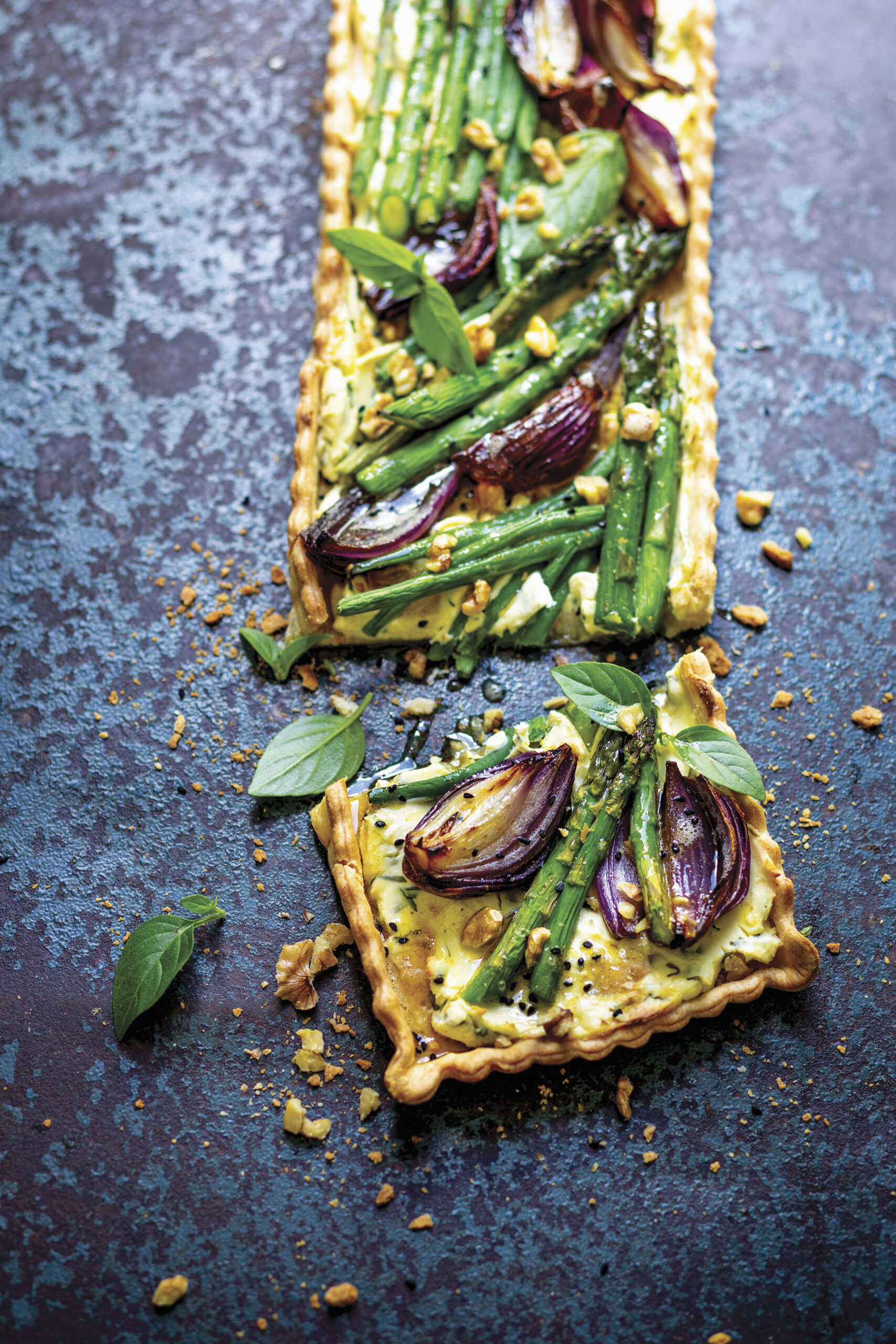 Tarte salée facile aux oignons rôtis et asperges (10 portions en entrée / 6 à 8 en plat principal) Ingrédients Tarte 2 rouleaux de pâte feuilletée (± 500 g au total) 800 g d’asperges ve ...