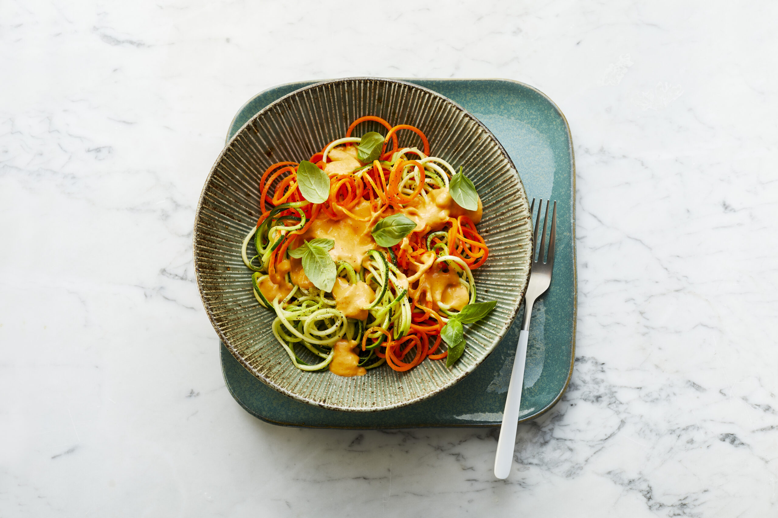 Zoodles à l’italienne avec sauce aux poivrons (10 personnes) Ingrédients Zoodles 10 courgettes moyennes (± 2,5 kg au total) 2 c. à soupe d’huile d’olive Sel Sauce aux poivrons ...