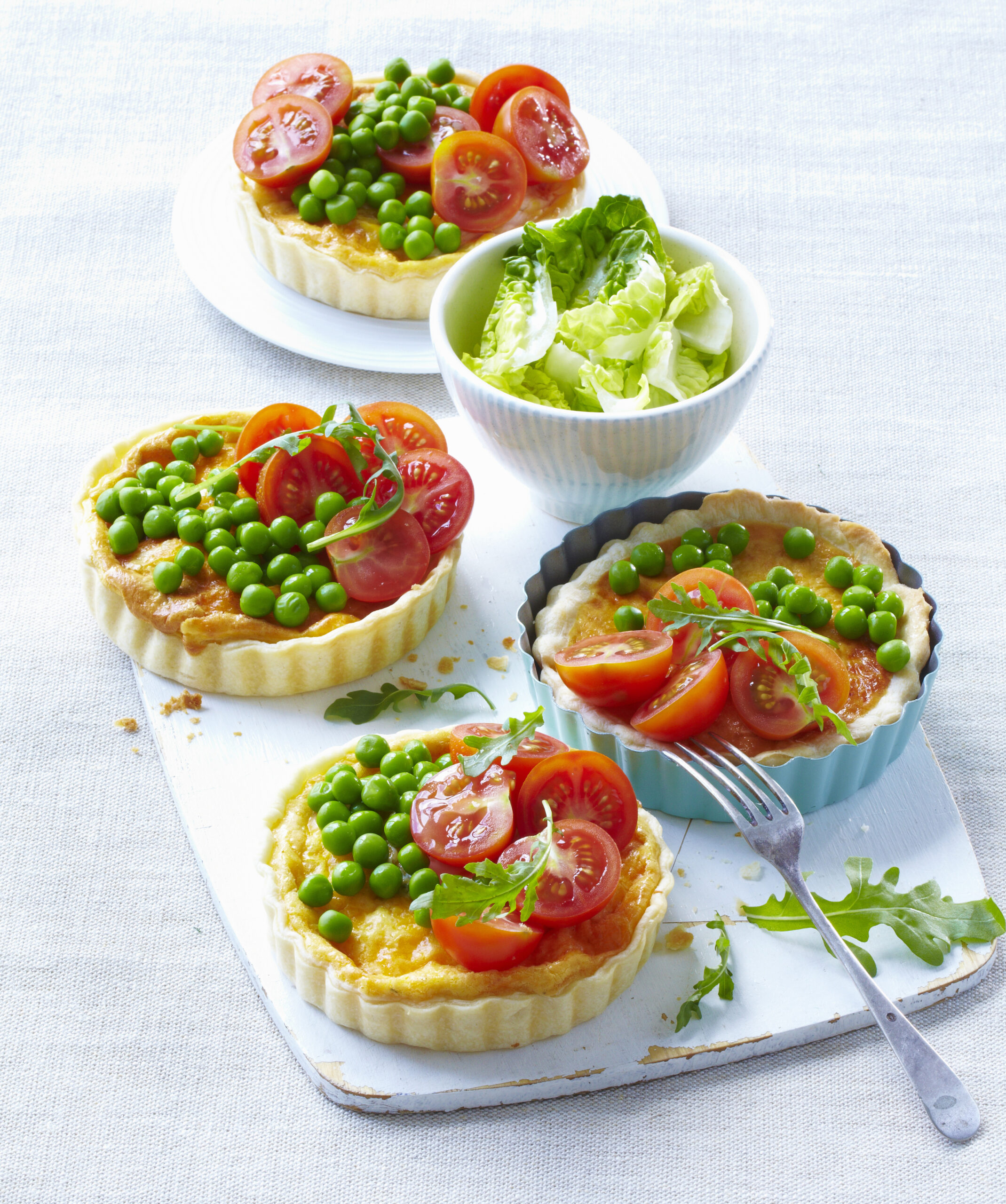 Mini quiches salées aux légumes d’été (10 personnes) Ingrédients Base & appareil 10 fonds de quiche ronds (Ø 10 cm) ou 2 grands moules à tarte 8 œufs 400 ml de crème (35 %) 15 ...