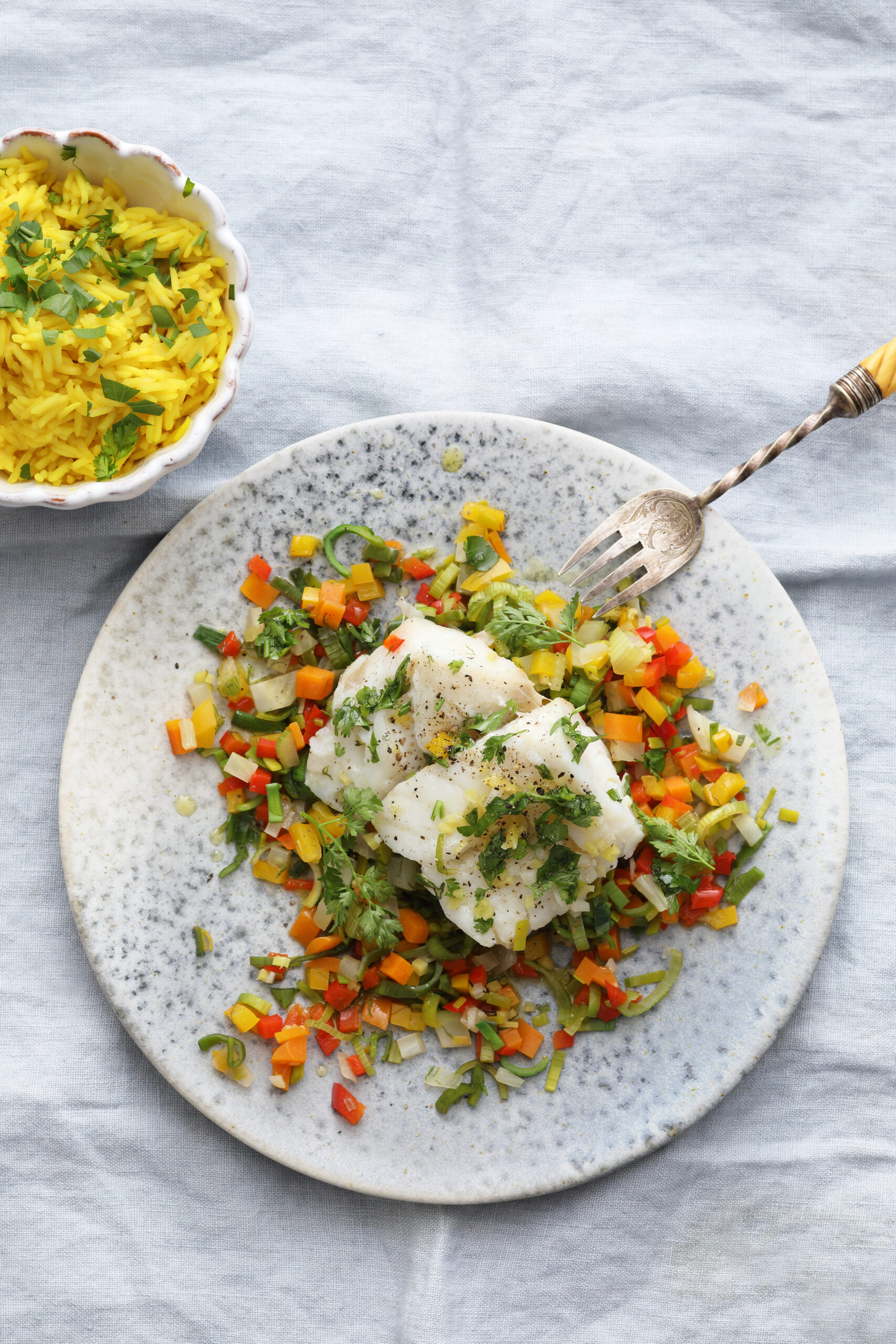 Cabillaud sur lit de brunoise de légumes (10 personnes) Ingrédients Poisson 10 filets de cabillaud (env. 150–160 g par portion) Sel, poivre blanc Brunoise de légumes 400 g de ...