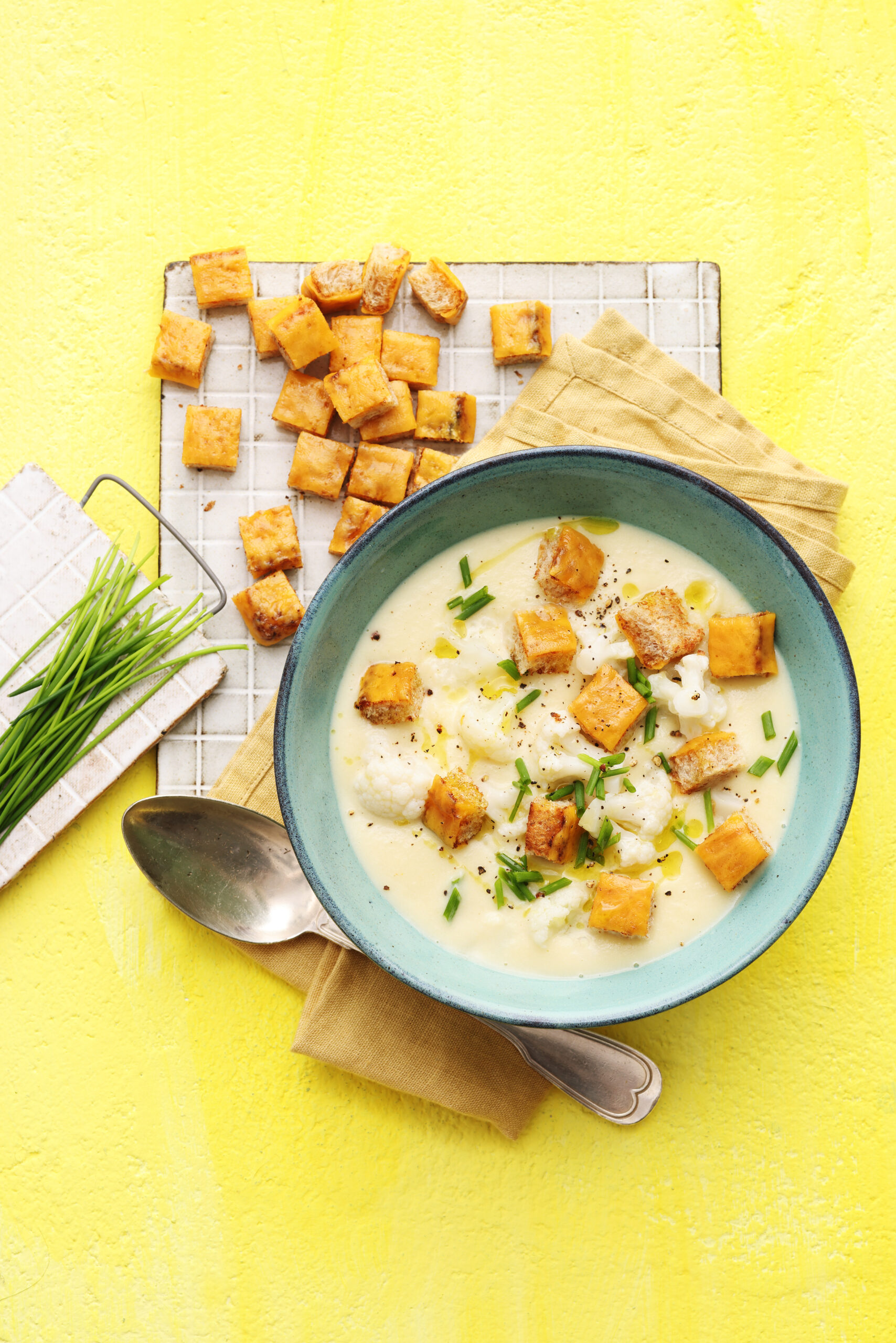 Soupe estivale de chou-fleur avec croûtons (10 personnes) Ingrédients Soupe 2 kg de chou-fleur (poids net après découpe) 2 oignons, émincés 3 gousses d’ail 1,5 l de bouillon de lé ...