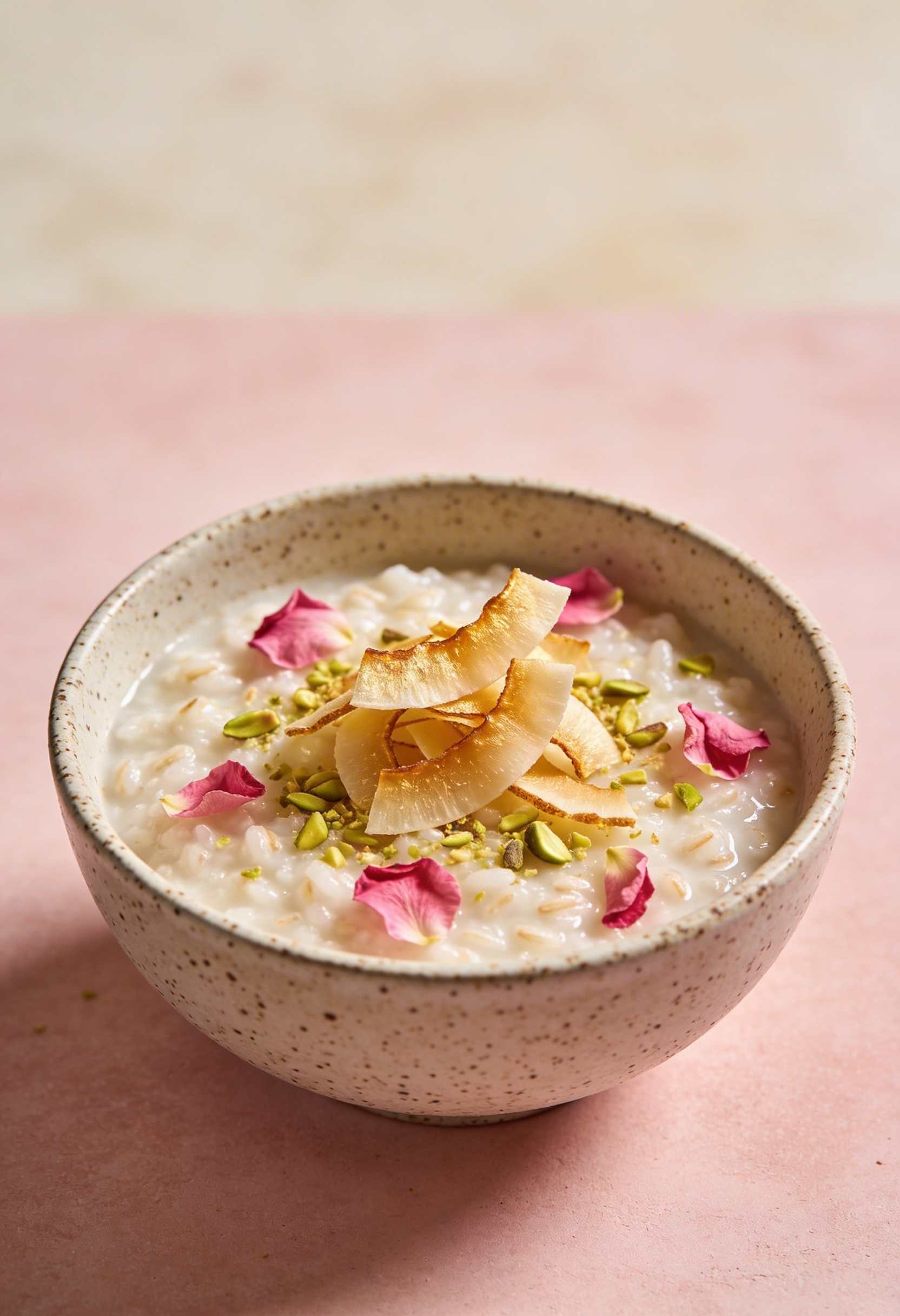 Riz au lait coco, rose et pistaches