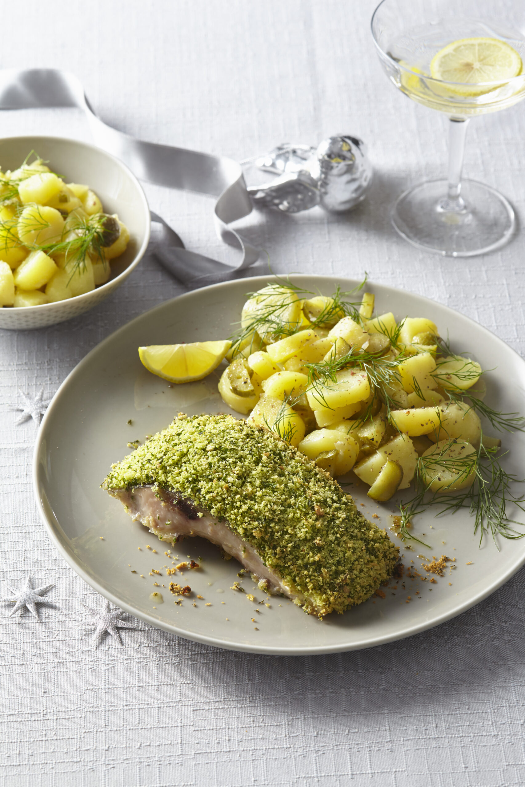 Lotte en croûte d’herbes, salade de pommes de terre (10 personnes) Ingrédients Lotte 1,6 kg de lotte, en médaillons Sel, poivre, huile Croûte d’herbes 100 g de chapelure (pank ...
