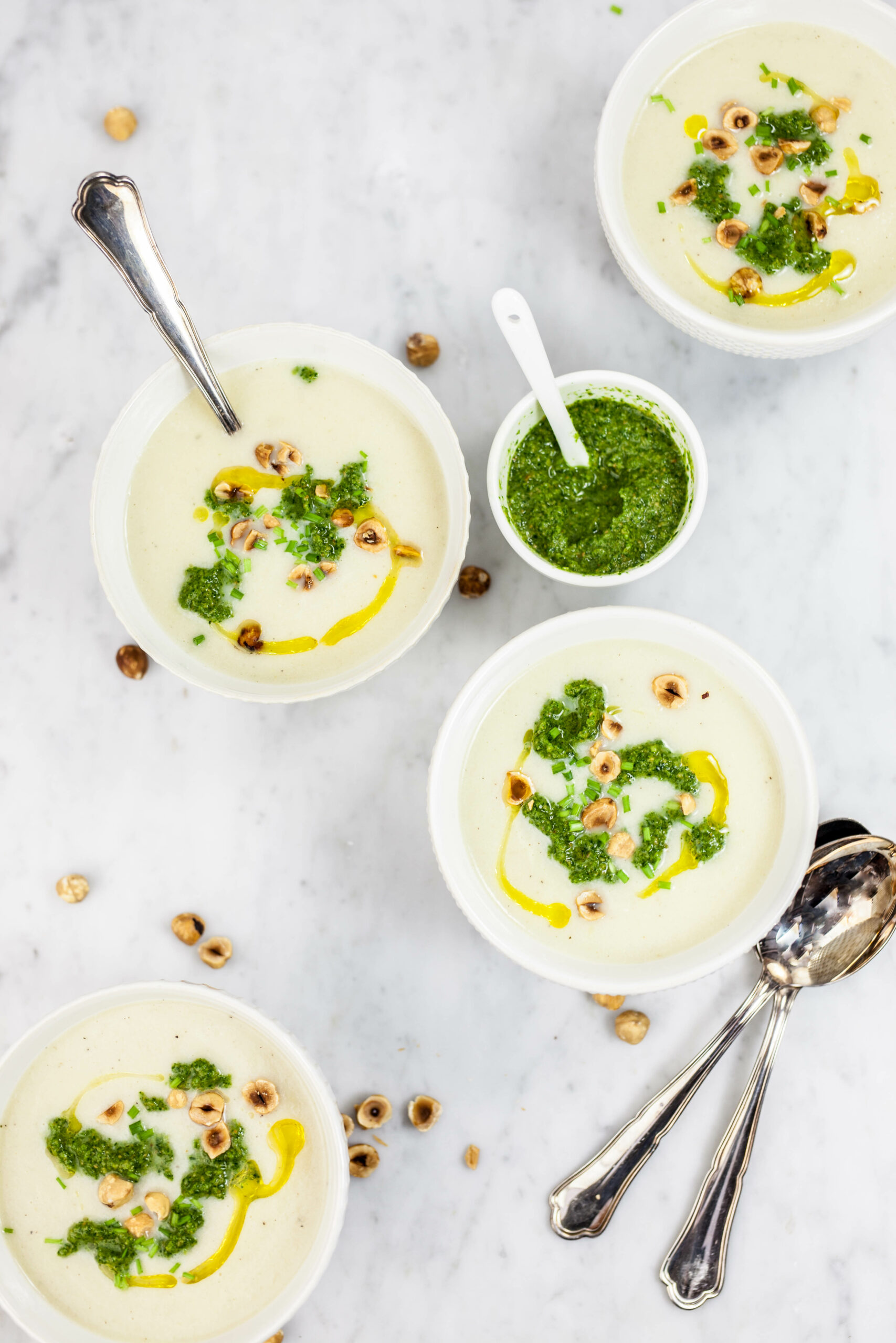 Velouté de chou-fleur aux herbes, pesto et noisettes