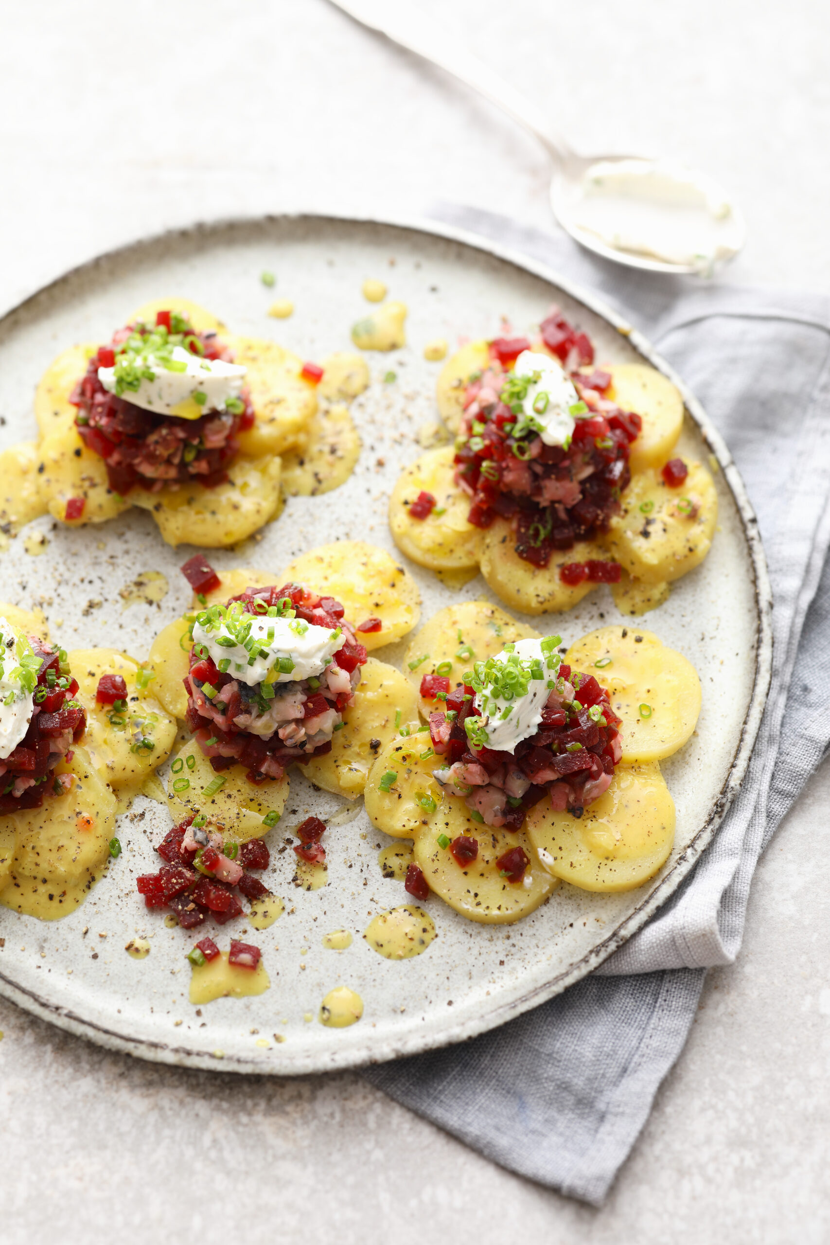 Aardappelbloempjes met tartaar van haring en rode bietBereiding: 30 minutenGaartijd: 10 minutenBudget: niet duurIngrediënten voor 4 personen:8 kleine aardappelen3 gekookte rode bieten1 grote gerookte ...