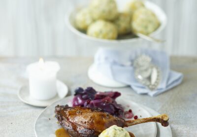 Gekonfijte eend gesmoord in moutbier met rode kool en broodknoedels