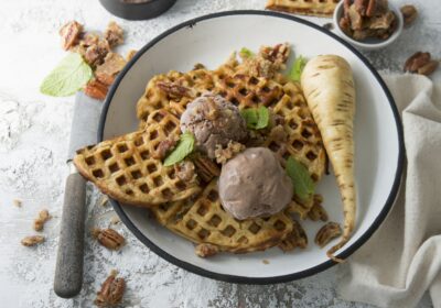 Pastinaakwafeltjes met chocolade-sinaasappelijs