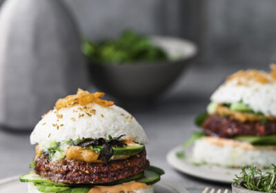 Sushi-rijstburgerBereiding: 30 minuten Oventijd: 30 minuten Budget: voordeligIngrediënten voor 4 personen: 4 s4 hamburgers (vlees…