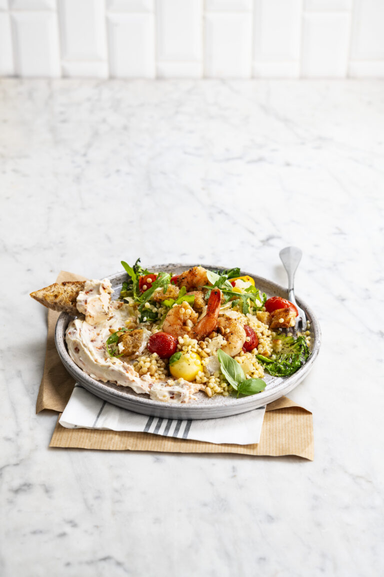 1. Meng de scampi’s met de kippenkruiden en bak krokant gaar in olijfolie. Zet deze appart, ze mogen lauw zijn bij serveren