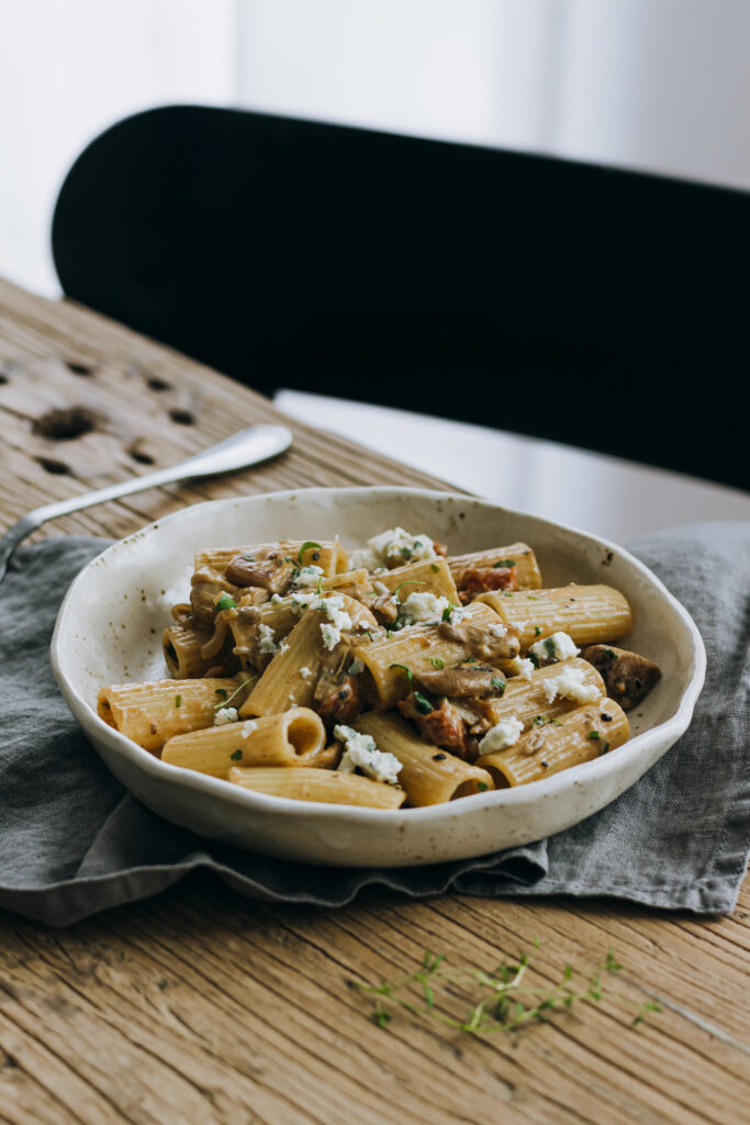 Volkoren rigatoni met porcini-paddenstoelen en blauwe kaas