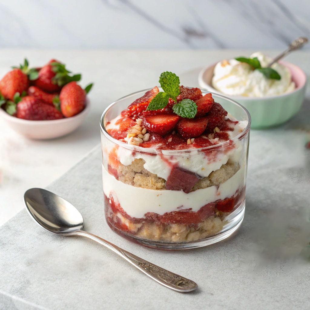 6. Ajoutez une généreuse cuillère de crème fouettée, quelques morceaux de fraises et une demi-cuillère de confiture de fraises. Répétez les couches jusqu’à épuisement des ingrédients.