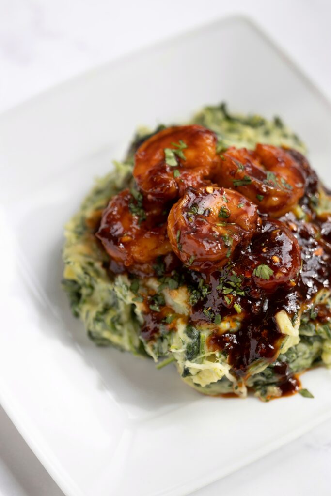 Stamppot d’épinards avec scampis teriyaki